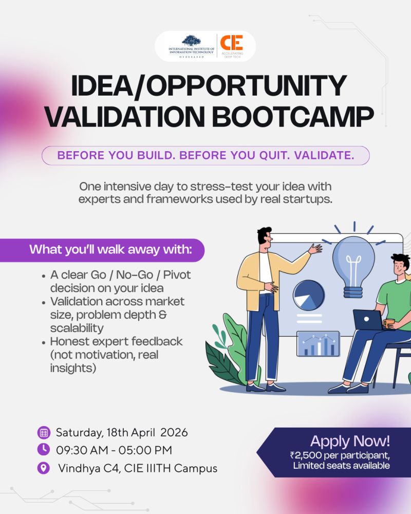 CIE IIIT Hyderabad invites you to the IVB before you invest months building your idea, invest one day validating it. The bootcamp helps you assess your idea’s market potential, scalability, and feasibility through expert feedback.