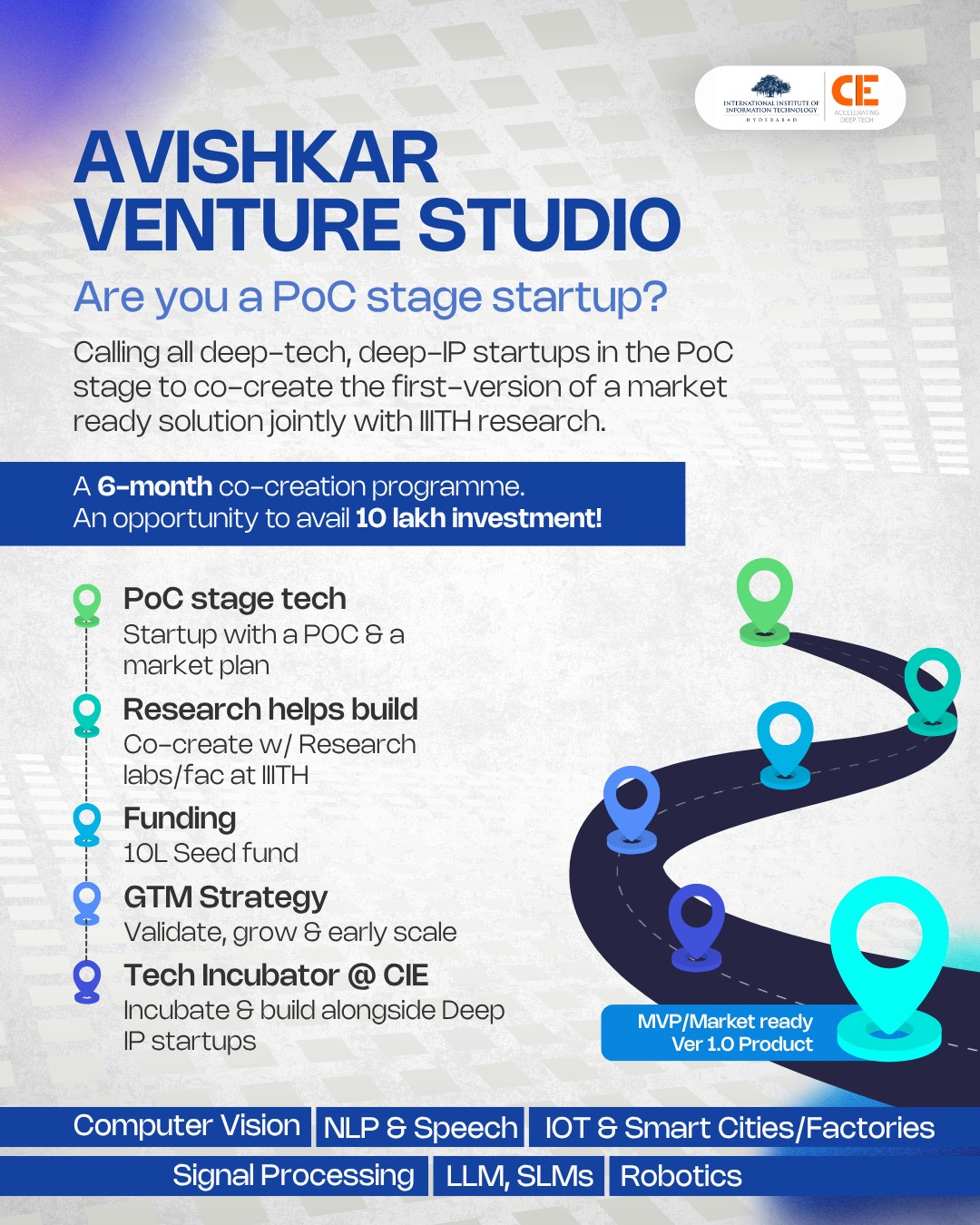 CIE IIIT Hyderabad invites applications for the Avishkar Venture Studio, a 6-month intensive program designed for deep-tech and deep-IP startups at the PoC stage.