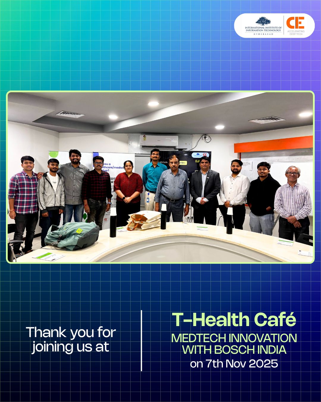 CIE IIIT-H hosted the T-Health Café on 7th November 2025, featuring Mr. Amjad Khan Patan and Mr. Rajani Kumar Bevara from Bosch Global Software Technologies. Their insights on MedTech innovation and corporate–startup collaboration greatly enriched the session.